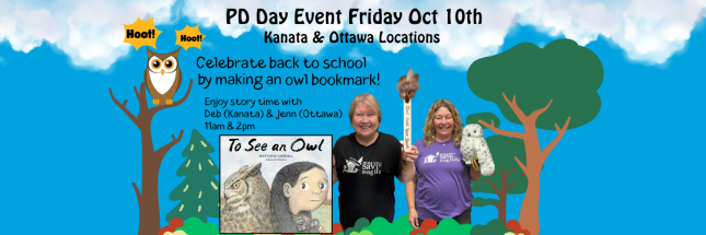 Make your very own owl bookmark and cozy up for story time with Deb (Kanata) and Jenn (Ottawa) at 11am and 2pm. They will be reading the beautiful book To See an Owl by Matthew Cordell, a magical tale that captures the wonder, effort, and excitement of spotting a special wild bird.